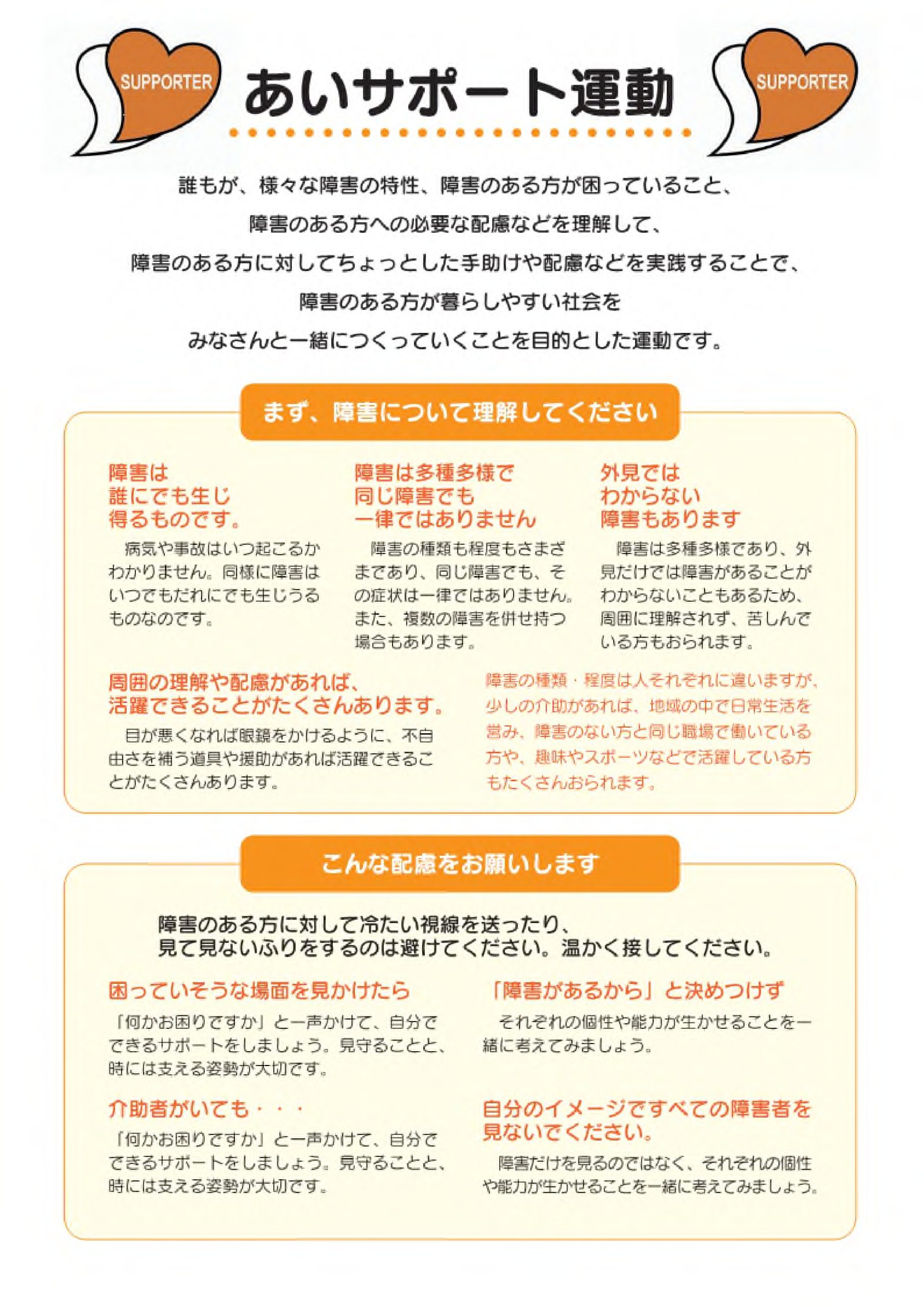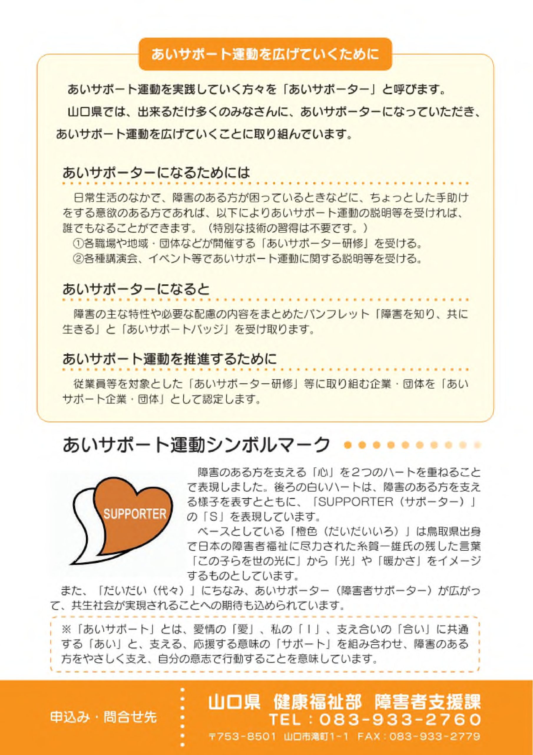 【山口県】あいサポーター研修(オンライン)開催について 投稿者: システム管理者2026年1月30日2026年1月30日行政、講習会 誰もが障害に対する理解を深め、障害のある人に必要な配慮を実践する「あいサポート運動」の一層の推進を図るため、オンラインでのあいサポーター研修が開催されます。 日時:令和8年2月27日(金) 時間:14時~15時10分(約70分) 内容(予定): 障害者差別解消法について あいサポート運動の概要について 様々な障害や必要な配慮について 等 山口県からの通知文 あいサポート運動(山口県HP)