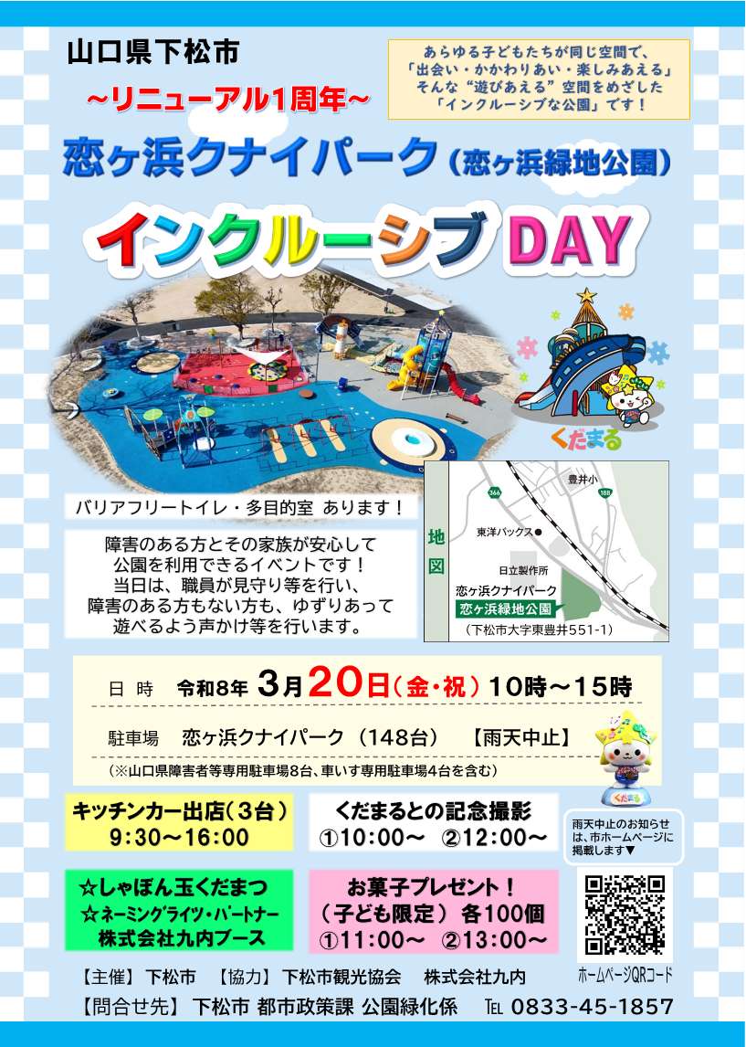 【下松市】インクルーシブ DAY(3/20) 投稿者: システム管理者2026年3月10日2026年3月10日行政 恋ヶ浜クナイパーク(恋ヶ浜緑地公園)では、リニューアルオープンから1周年して、障害のある方とその家族が安心して公園を利用できるイベント「インクルーシブ DAY(3/20)」が開催されます。 主 催: 下松市 協 力: 下松市観光協会、株式会社九内 開催日: 和8年3月20日(金・祝)10時~15時 【雨天中止】 詳しくは「恋ヶ浜クナイパーク(恋ヶ浜緑地公園)インクルーシブイベントの開催について」(下松市ホームページ)をご覧ください