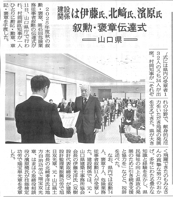 【事務所協会】令和7年度叙勲受章者について 投稿者: システム管理者2025年12月17日2025年12月17日事務所協会 (11/4初掲、12/17更新) 令和7年秋の叙勲受章者が発表され、当協会の伊藤元会長が「旭日双光章」を受賞されました。 旭日双光章 (一社)山口県建築士事務所協会 元会長 (一社)日本建築士事務所協会連合会 元副会長 伊藤 光洋 12月11日に村岡知事から勲記及び勲章を伝達されました。 ■ 中建日報記事 国土交通省関係の受章者はこちらのホームページをご覧ください。 日事連関係:叙勲受章者、褒章受章者
