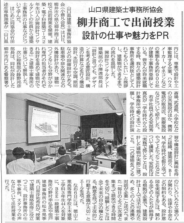 【活動報告】柳井商工高等学校で出前授業を実施しました。 投稿者: システム管理者2025年11月19日2025年11月19日活動報告 当協会では、令和7年11月14日(金)に、柳井商工高等学校の建築・電子科の2年生13名を対象に出前講座を実施しました。 講義概要 建築設計事務所の業務について 建築設計事務所の仕事について 設計事務所スタッフの声 ご協力会員 (株)巽設計コンサルタント (外部リンク) 写真 建築設計事務所の仕事について 柳井市内の建築物について 設計事務所のスタッフの声 設計事務所のスタッフの声 ■ 中建日報記事