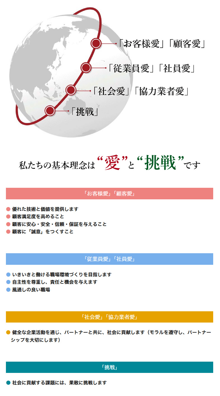 弊社の基本理念は、“愛”と“挑戦”です。「顧客愛」としてお客様に誠意を尽くし、「社員愛」としてスタッフがいきいきと働ける環境を整え、「社会愛」として社会貢献のために、さまざまな課題に果敢に「挑戦」を続けてまいります。